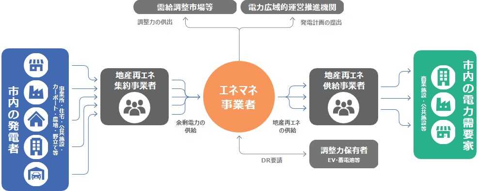 この取り組みは、市内の太陽光発電などで作られたエネルギーを、市内の事業所等へつなぎ、有効活用するものです。市単位のエネルギー管理としては全国初のモデルで、地域でのエネルギー自給と、地球に優しい脱炭素社会の実現を目指しています。